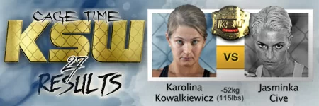 Czwarta walka z głównej karty gali KSW27 - Cage Time i pierwsza o mistrzowski pas, pas należący do Karoliny Kowalkiewicz, a który odebrać Polce chce Austriaczka Jasminka Cive.