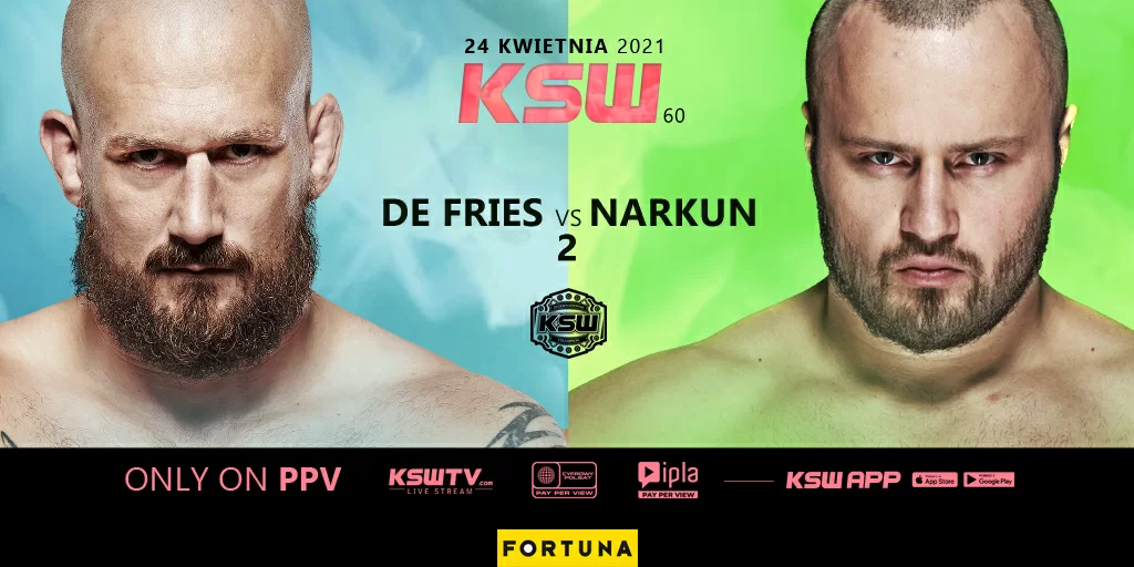 Po 737 dniach od ich pierwszego spotkania dwóch panujących mistrzów KSW ponownie skrzyżuje rękawice. Na KSW 60 czempion królewskiej kategorii wagowej, Phil de Fries (19-6, 3 KO, 12 Sub) stanie do kolejnej obrony tytułu, a jego rywalem 24 kwietnia będzie posiadacz pasa w kategorii półciężkiej, Tomasz Narkun (18-3, 3 KO, 14 Sub).