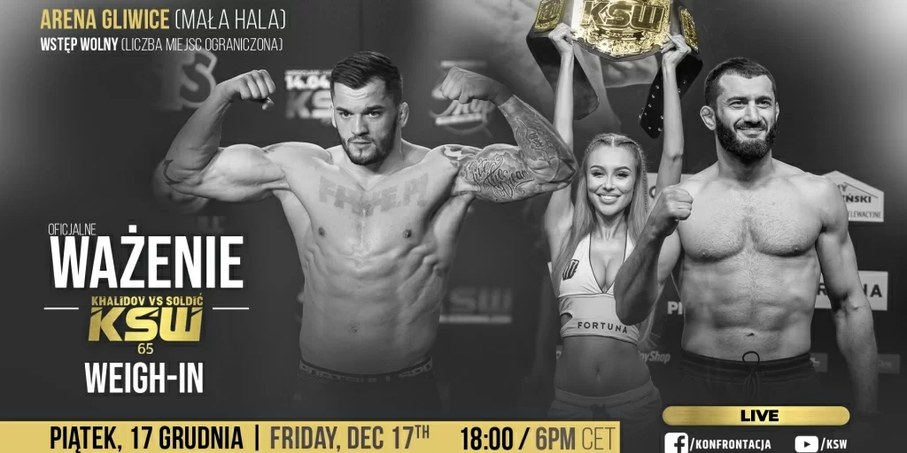 Federacja KSW pragnie zaprosić fanów na oficjalną ceremonię ważenia przed galą KSW 65. Ważenie odbędzie się w piątek, 17 grudnia o 18:00 w małej hali Areny Gliwice. Obowiązuje wstęp wolny dla wszystkich kibiców, ale liczba osób wpuszczonych będzie ograniczona. Oficjalną ceremonię ważenia i face to face kibice będą mogli obejrzeć również na żywo na Facebooku i kanale YouTube organizacji KSW.