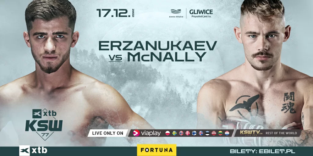 Podczas gali XTB KSW 77 w Arenie Gliwice dojdzie do konfrontacji dwóch niepokonanych zawodników będących na początku swojej zawodowej drogi. Shamad Erzanukaev (1-0), uważany za jeden z ciekawszych talentów młodego pokolenia nad Wisłą, zmierzy się ze znanym z efektownych skończeni Carlem McNallym (2-0, 2 Sub). Pojedynek zakontraktowany w kategorii koguciej odbędzie się 17 grudnia. #Gliwice