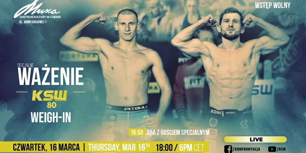 Organizacja KSW pragnie zaprosić fanów oraz przedstawicieli mediów na oficjalne ważenie przed galą KSW 80, które odbędzie się w czwartek, 16 marca w Centrum Kultury Muza, przy ulicy Armii Krajowej 1 w Lubinie. Ceremonia rozpocznie się o godzinie 18:00. Wstęp dla fanów będzie wolny. Oficjalną ceremonię ważenia i face to face kibice będą mogli obejrzeć również na żywo na Facebooku i kanale YouTube organizacji KSW. Przed ważeniem, o godzinie 16:50 odbędzie się również Q&A z gościem specjalnym.
