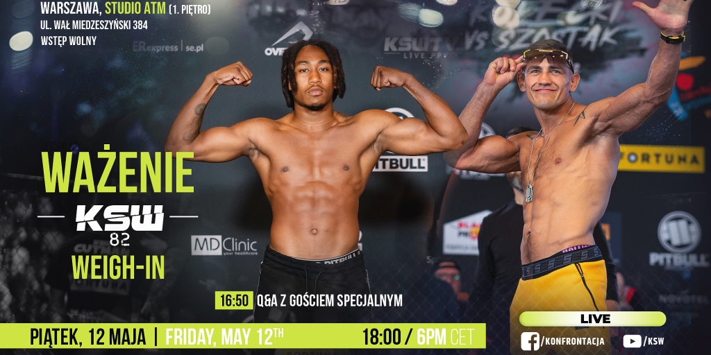 Organizacja KSW pragnie zaprosić fanów oraz przedstawicieli mediów na oficjalne ważenie przed galą KSW 82, które odbędzie się w piątek, 12 maja w ATM Studio przy ulicy Wał Miedzeszyński 384 w Warszawie. Ceremonia rozpocznie się o godzinie 18:00. Wstęp dla fanów będzie wolny.
