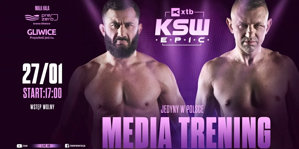 Trening medialny połączony ze Strefą Fana przed XTB KSW Epic odbędzie się w sobotę, 27 stycznia o godzinie 17:00 w Małej Hali PreZero Arena Gliwice przy ulicy Akademickiej 50. Wstęp dla fanów na wydarzenie jest wolny. Na miejscu pojawią się bohaterowie walki wieczoru, legendy świata sportu, Mamed Chalidow i Tomasz Adamek. Kibice będą mieli też okazję spotkać się z innymi bohaterami gali XTB KSW Epic. Wydarzenie będzie również transmitowane na żywo na Facebooku i kanale YouTube organizacji KSW.