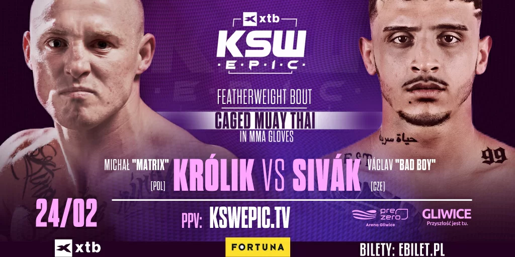Gala XTB KSW Epic przyniesie ekscytujące starcie w brutalnej formule muay thai dwóch czołowych europejskich stójkowiczów. Dodatkowym smaczkiem tego pojedynku będzie walka w małych rękawicach do MMA. W konfrontacji tej zmierzą się dwa popularne nazwiska z Polski i Czech: Michał "Matrix" Królik oraz Václav "Bad Boy" Sivák. Do rywalizacji w kategorii piórkowej dojdzie 24 lutego w PreZero Arenie Gliwice. #Gliwice
