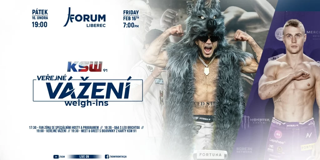 Federacja KSW zaprasza wszystkich fanów na oficjalną ceremonię ważenia przed galą KSW 91 w Libercu. Ważenie odbędzie się w piątek, 16 lutego o 19:00 w Centrum Handlowym Forum w Libercu. Wstęp dla kibiców na ważenie jest wolny. Już o godzinie 17:30 wystartuje Strefa Fana otwarta dla wszystkich fanów KSW. Na miejscu pojawią się między innymi goście specjalni w osobach Michala Martinka, Viktora Pesty, Vaclava Sivaka, Andre Reindersa i Marpo. Na fanów będzie czekało również wiele atrakcji od partnerów KSW. Po ważeniu kibice będą mieli okazję spotkać się z bohaterami sobotniej gali, zdobyć od nich autografy, zdjęcia i zamienić kilka słów. Oficjalną ceremonię ważenia i face to face fani będą mogli obejrzeć również na żywo na Facebooku i kanale YouTube organizacji KSW.