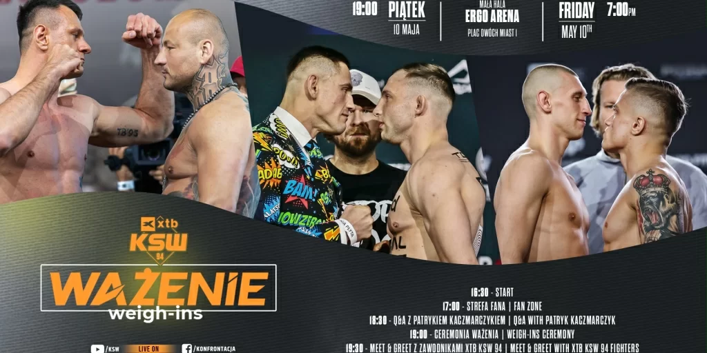 Federacja KSW zaprasza wszystkich fanów na oficjalną ceremonię ważenia przed galą XTB KSW 94 na granicy Gdańska i Sopotu. Ważenie odbędzie się w piątek, 10 maja o 19:00 w małej hali ERGO ARENY. Wstęp dla kibiców na ważenie jest wolny. Już o godzinie 16:30 wystartuje Strefa Fana otwarta dla wszystkich fanów KSW, podczas której pojawią się goście specjalni oraz różne atrakcje od KSW i partnerów organizacji. Po ważeniu kibice będą mieli okazję spotkać się z bohaterami sobotniej gali, zdobyć od nich autografy, zdjęcia i zamienić kilka słów. Oficjalną ceremonię ważenia i face to face fani będą mogli obejrzeć również na żywo na Facebooku i kanale YouTube organizacji KSW.
