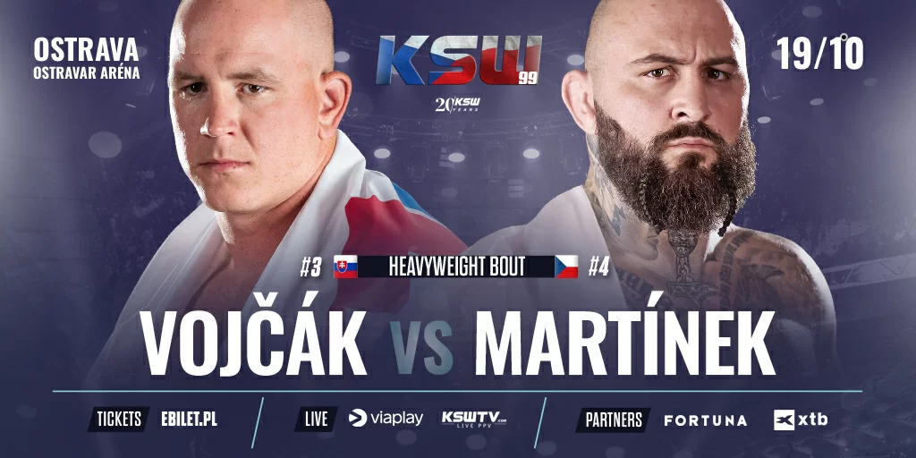 Już 19 października organizacja KSW powróci do Czech, aby w Ostrawie zorganizować galę KSW 99. W walce wieczoru Štefan Vojčák (8-1, 4 KO, 3 Sub), który w rankingu wagi ciężkiej KSW zajmuje miejsce trzecie, zmierzy się z numerem cztery tego zestawienia, czołowym czeskim zawodnikuen królewskiej kategorii wagowej Michalem Martínkiem (11-5, 7 KO, 1 Sub). Matúš Juráček (11-3, 4 KO, 2 Sub), numer dziewięć kategorii półśredniej, stanie do rywalizacji z gwarantującym emocje w klatce Kacprem Koziorzębskim (10-6, 4 KO). Vojtech Garba (8-5, 6 KO), numer dziesięć rankingu wagi półciężkiej, skonfrontuje się natomiast z numerem siedem, prawdziwym specjalistą od nokautów, Rafałem Kijańczukiem (12-7, 11 KO). Gala odbędzie się w hali Ostravar Aréna.