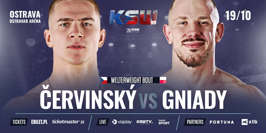 19 października podczas gali KSW 99 w Ostrawie dojdzie do ciekawego pojedynku utalentowanych zawodników młodego pokolenia. W starciu tym pochodzący z Czech Viktor Červinský (4-1, 1 KO, 2 Sub) stanie do rywalizacji z reprezentującym Polskę Michałem Gniadym (2-1, 2 KO). Walka w kategorii półśredniej odbędzie się w hali Ostravar Aréna.