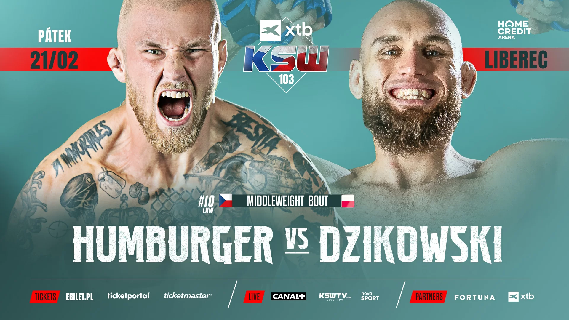 Podczas gali XTB KSW 103 w Libercu do rywalizacji powróci gwarantujący emocje w klatce lokalny bohater, Dominik Humburger (8-2, 7 KO), i stanie do walki z młodym talentem z Polski, Borysem Dzikowskim (4-1, 2 KO). Do starcia toczonego w kategorii średniej dojdzie 21 lutego 2025 roku w hali Home Credit Arena.