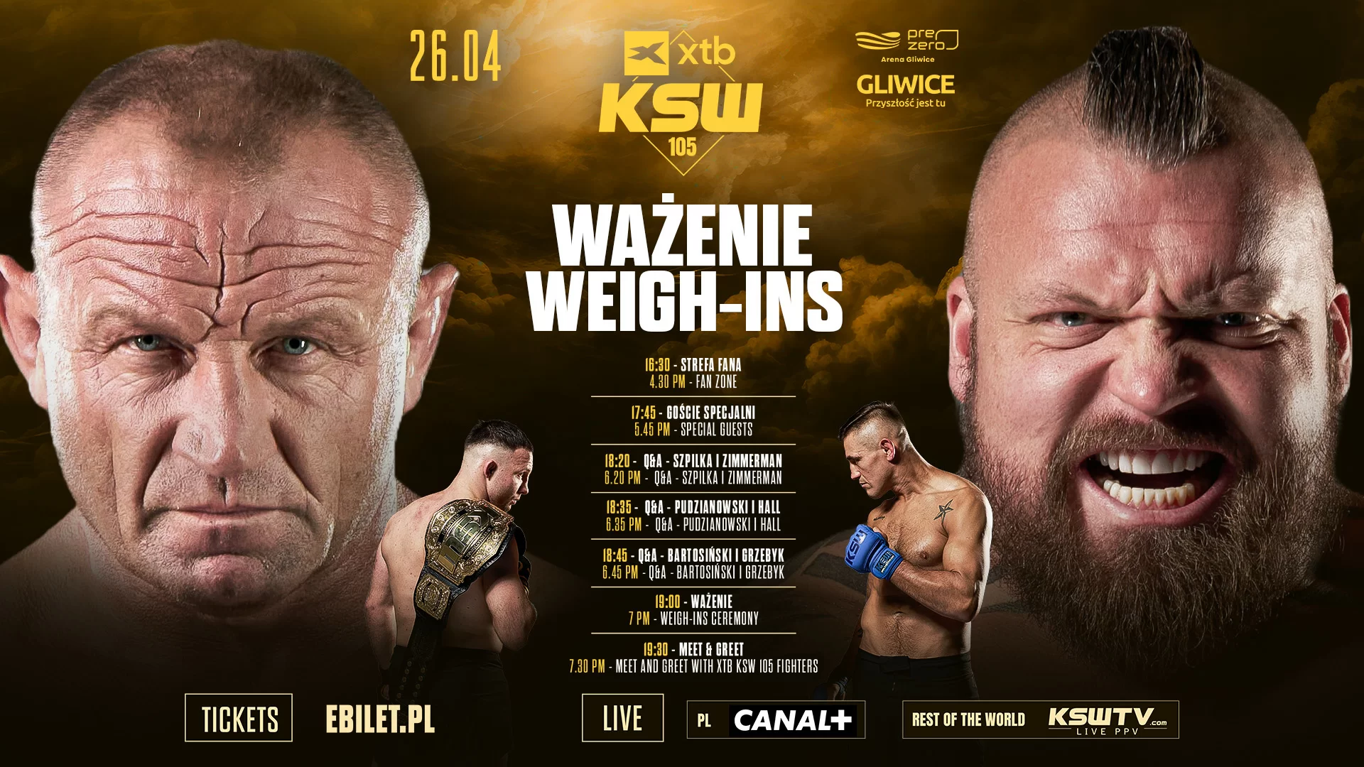 Federacja KSW zaprasza wszystkich fanów oraz media na oficjalną ceremonię ważenia oraz Strefę Fana przed galą XTB KSW 105 w Gliwicach. Ważenie odbędzie się w piątek, 25 kwietnia o godzinie 19:00 w małej arenie PreZero Areny Gliwice. Również w piątek o godzinie 16:30 wystartuje Strefa Fana otwarta dla wszystkich fanów KSW.