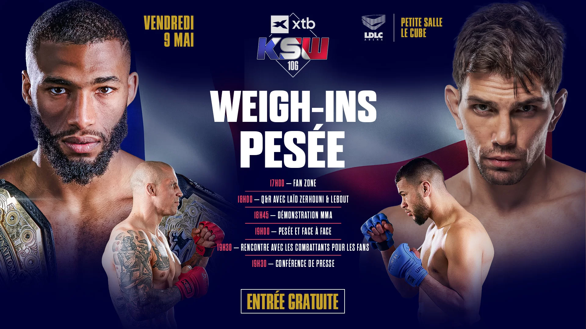 Federacja KSW zaprasza wszystkich fanów oraz media na oficjalną ceremonię ważenia oraz Strefę Fana przed galą XTB KSW 106 w Lyonie. Ważenie odbędzie się w piątek, 9 maja w małej hali LDLC Arena. Wstęp dla kibiców na to wydarzenie jest wolny. O godzinie 17:00 wystartuje Strefa Fana otwarta dla wszystkich fanów KSW.