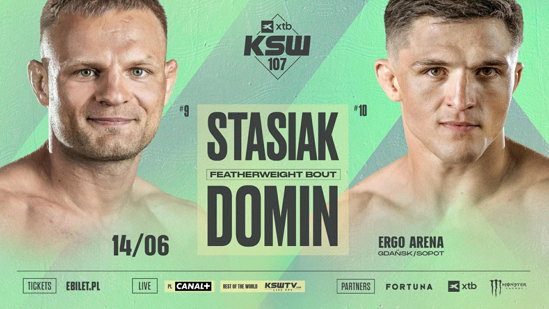 Do mocnego pojedynku w kategorii piórkowej dojdzie podczas gali XTB KSW 107Damian Stasiak (14-10, 1 KO, 11 Sub), były pretendent do pasa wagi koguciej, a dziś numer dziewięć rankingu wagi piórkowej, zetrze się z numerem dziesięć tego zestawienia, będącym na fali trzech zwycięstwach z rzędu Michałem Dominem (7-3, 3 KO, 2 Sub). Dla Damiana Stasiaka walka na XTB KSW 107 będzie pożegnalnym, ostatnim pojedynkiem w karierze. Do konfrontacji dojdzie 14 czerwca w gdańsko-sopockiej ERGO ARENIE.