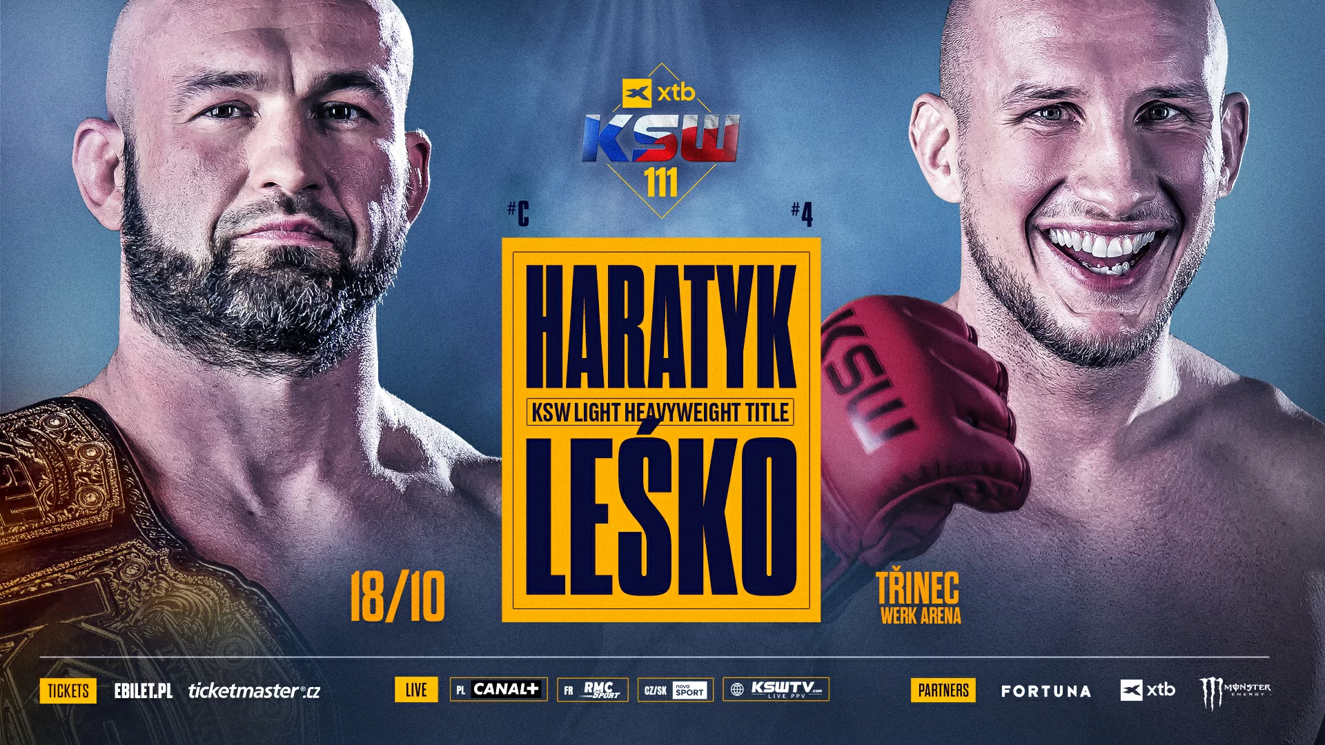 Podczas gali XTB KSW 111 dojdzie do pojedynku na szczycie wagi półciężkiej, w którym Rafał Haratyk (20-5-2, 7 KO, 5 Sub) stanie do drugiej obrony pasa mistrzowskiego. Jego rywalem będzie dający efektowne pojedynki Bartosz Leśko (15-5-2, 2 KO, 7 Sub), numer cztery tej kategorii. Do pojedynku mistrzowskiego dojdzie 18 października w Trzyńcu, w hali Werk Arena.