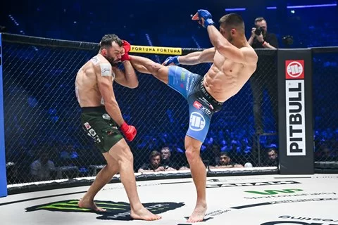 okrągłej klatki. Ostatni raz rywalizował w niej w kwietniu zeszłego roku, gdy starł się z Madarsem Fleminasem. Pojedynek był bardzo wyrównany. Obaj zawodnicy atakowali się w stójce i głównie w tej płaszczyźnie toczyli walkę. Pojawiły się jednak też elementy klinczu i rywalizacja na macie. W stójce panowie aktywnie pracowali na nogach i wchodzili w kickboxerskie wymiany. Fleminas dobrze trzymał dystans i cały czas starał się też wywierać presję, ale to Polak wydawał się być skuteczniejszy w swoich atakach. Po piętnastu minutach efektownego pojedynku sędziowie niejednogłośnie zwycięzcą wskazali Kacpra Koziorzębskiego.